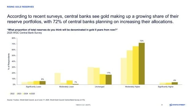 Additionally, in a survey conducted by the World Gold Council this year, 76% of central banks indicated they project the portion of their reserve portfolios allocated to gold will be moderately higher or significantly higher over the next five years: