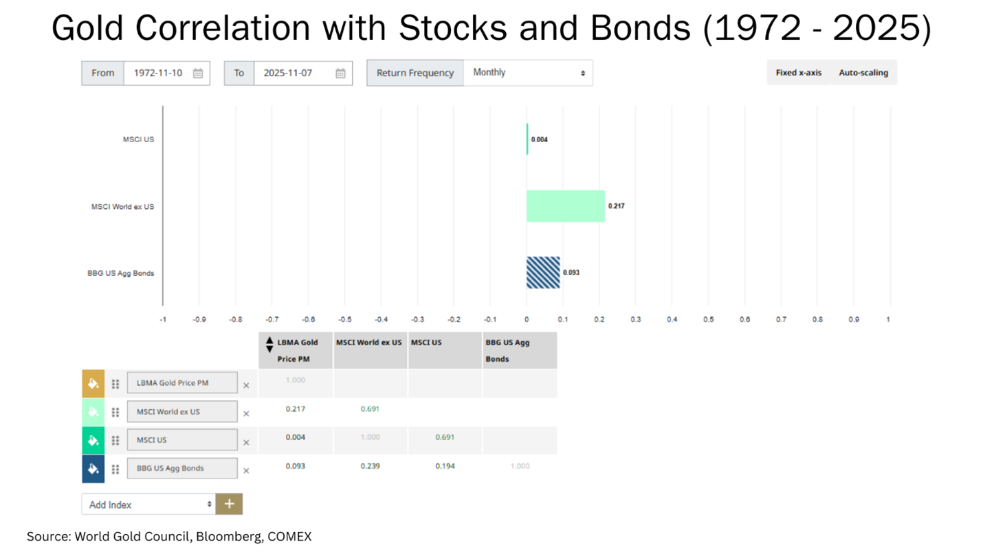 Over the timeframes in the chart above, gold provided stock-like returns with a low correlation to both global stocks and U.S. bonds.